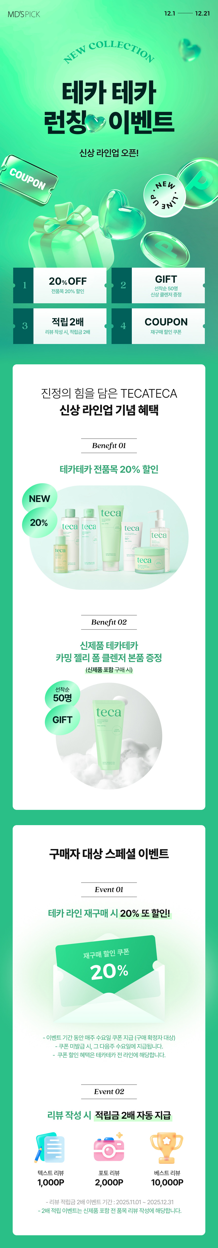 · [20% 재구매 할인쿠폰]은 구매 확정자 기준 매주 수요일에 지급되며, 미발급된 경우 그 다음주 수요일에 지급됩니다. (마지막 지급일 12/31수요일)