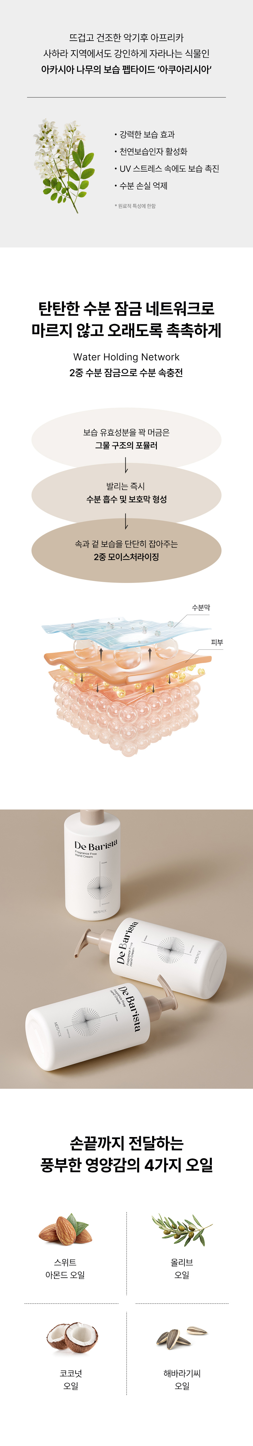 정제수, 프로판디올, 글리세린, 하이드로제네이티드폴리데센, 1,2-헥산디올, 세테아릴알코올, 세테아릴올리베이트, 올리브오일, 스위트아몬드오일, 해바라기씨오일, 코코넛오일, 카프릴릭/카프릭트리글리세라이드, 하이드롤라이즈드식물성단백질, 말토덱스트린, 소르비탄올리베이트, 판테놀, 아크릴레이트/C10-30알킬아크릴레이트크로스폴리머, 팔미틱애씨드, 트로메타민, 스테아릭애씨드, 잔탄검, 판토락톤, 미리스틱애씨드, 디소듐이디티에이, 에칠헥실글리세린