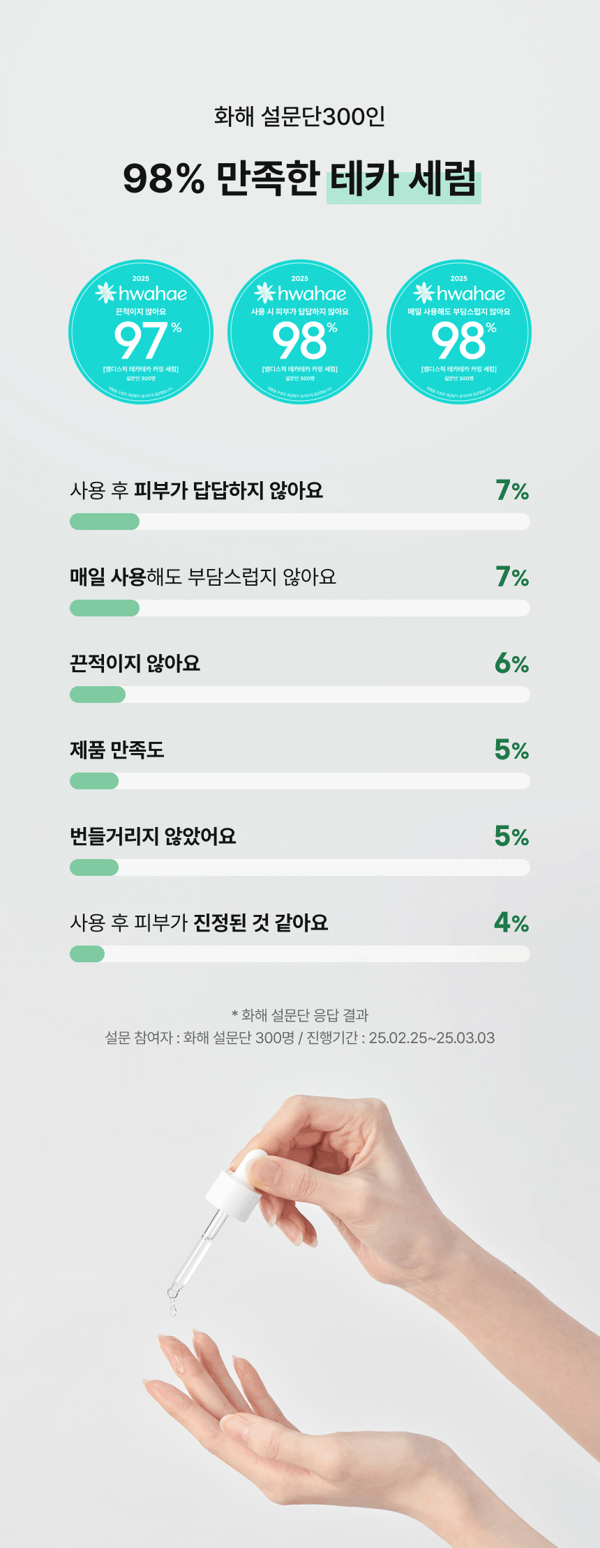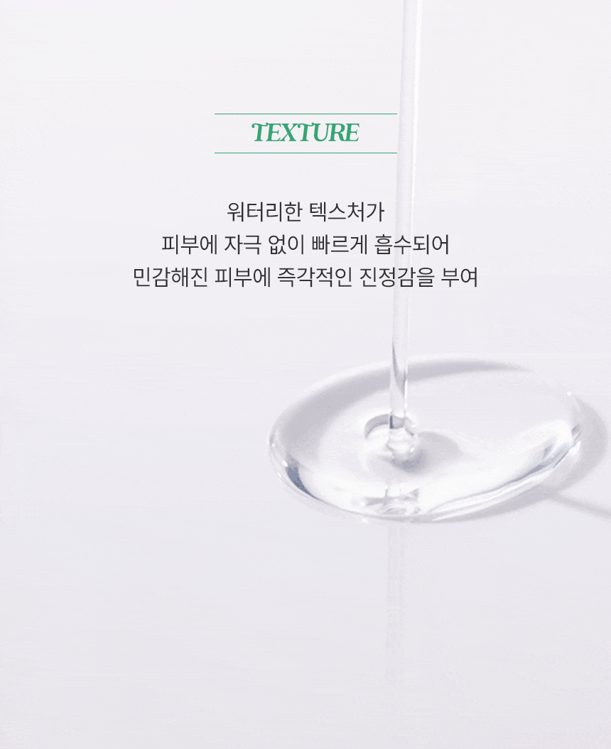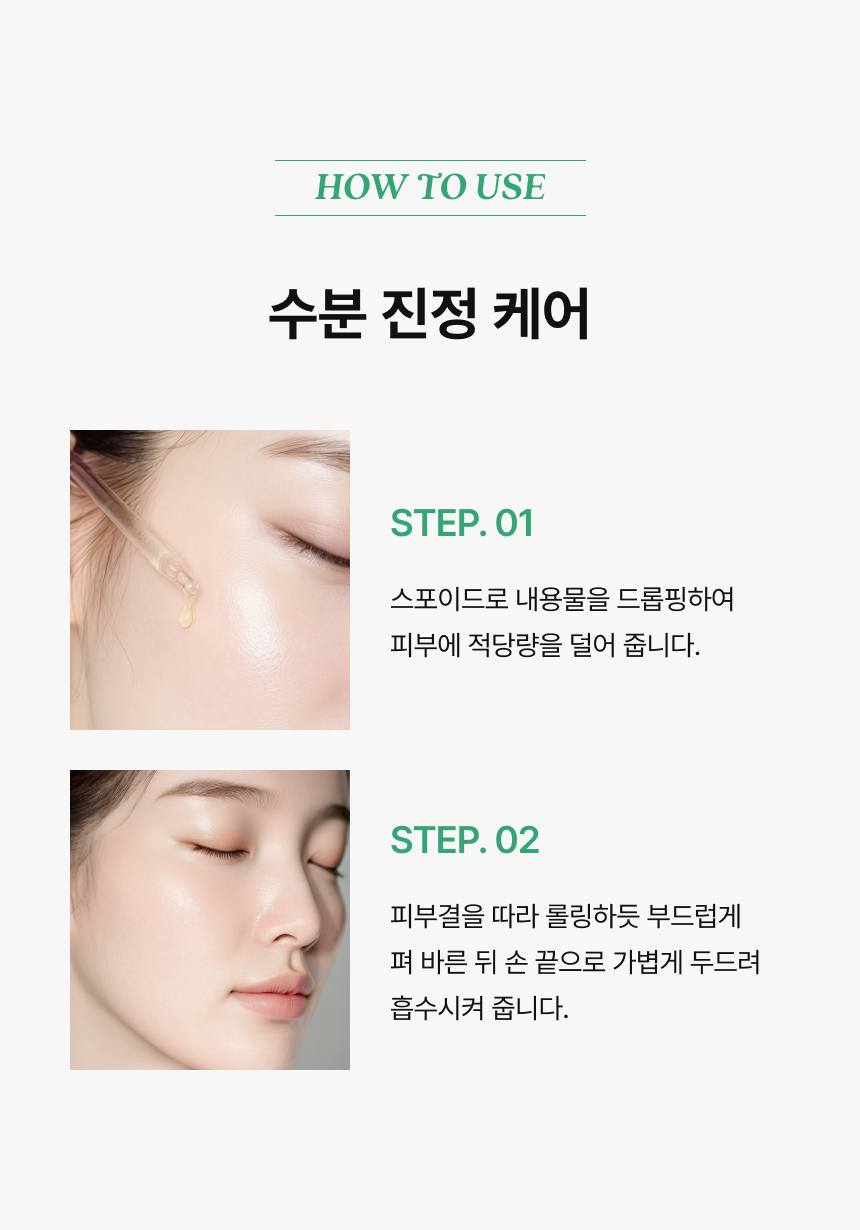 내용물을 적당량 덜어 피부결을 따라 부드럽게 펴 발라준 후 가볍게 두드려 흡수시켜 줍니다.