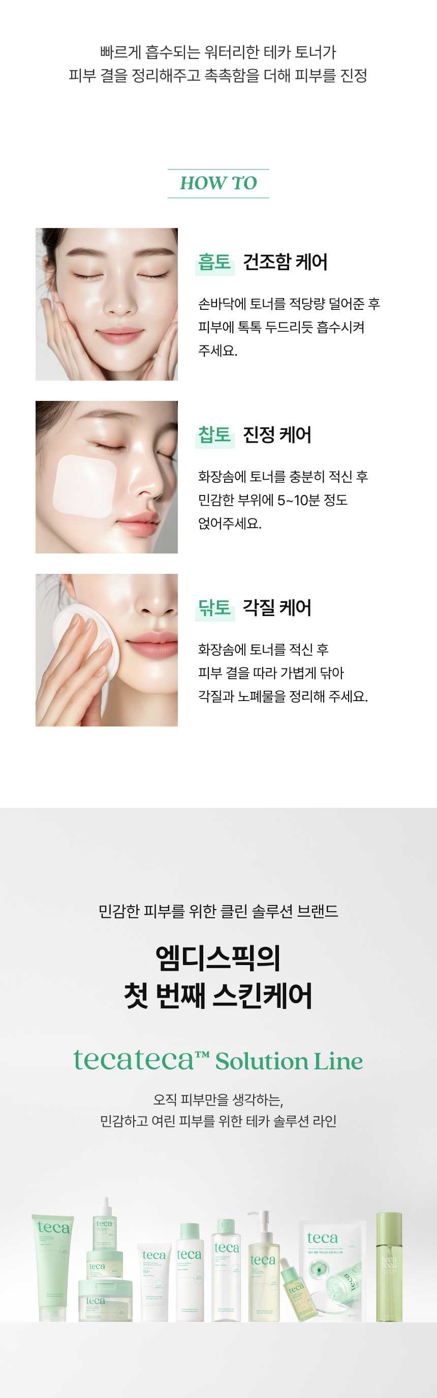 적당량을 취해 부드럽게 펴 발라 흡수시켜줍니다.