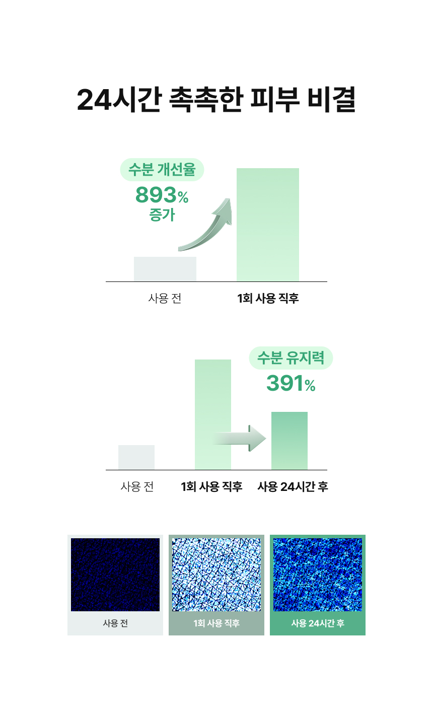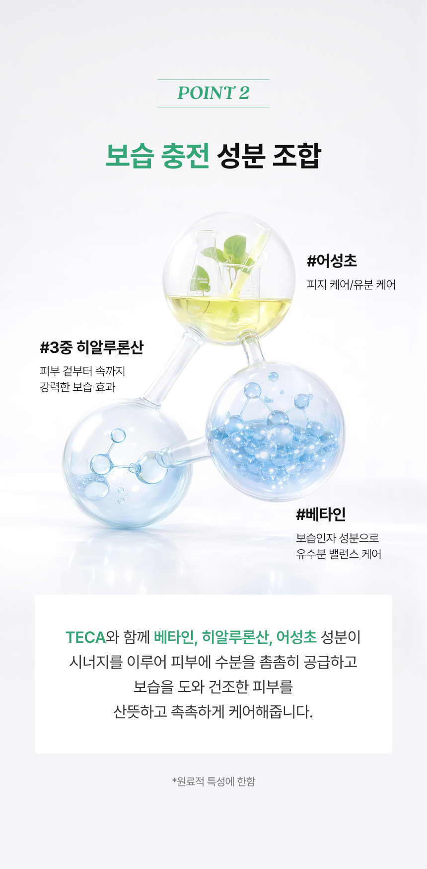 정제수, 글리세린, 1,2-헥산다이올, 에틸헥실스테아레이트, 폴리글리세릴-3다이스테아레이트, 하이드로제네이티드폴리(C6-14올레핀), 다이카프릴릴카보네이트, 글리세릴스테아레이트, 암모늄아크릴로일다이메틸타우레이트/브이피코폴리머, 카보머, 트로메타민, 소듐스테아로일글루타메이트, 베타인, 에틸헥실글리세린, 글리세릴스테아레이트시트레이트, 부틸렌글라이콜, 소듐하이알루로네이트, 로즈마리잎추출물, 토코페롤, 하이드로제네이티드레시틴, 하이드롤라이즈드하이알루로닉애씨드, 나이아신아마이드, 약모밀추출물, 백미꽃추출물, 소듐아세틸레이티드하이알루로네이트, 아시아티코사이드(40ppb), 아시아틱애씨드(30ppb), 마데카식애씨드(30ppb), 다이소듐이디티에이