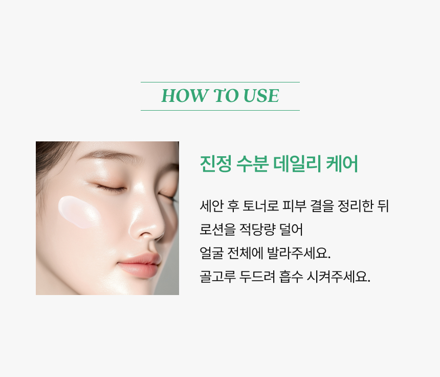 세안 후 토너로 피부 결을 정돈하고, 적당량을 덜어 얼굴 전체에 부드럽게 펴 발라줍니다.