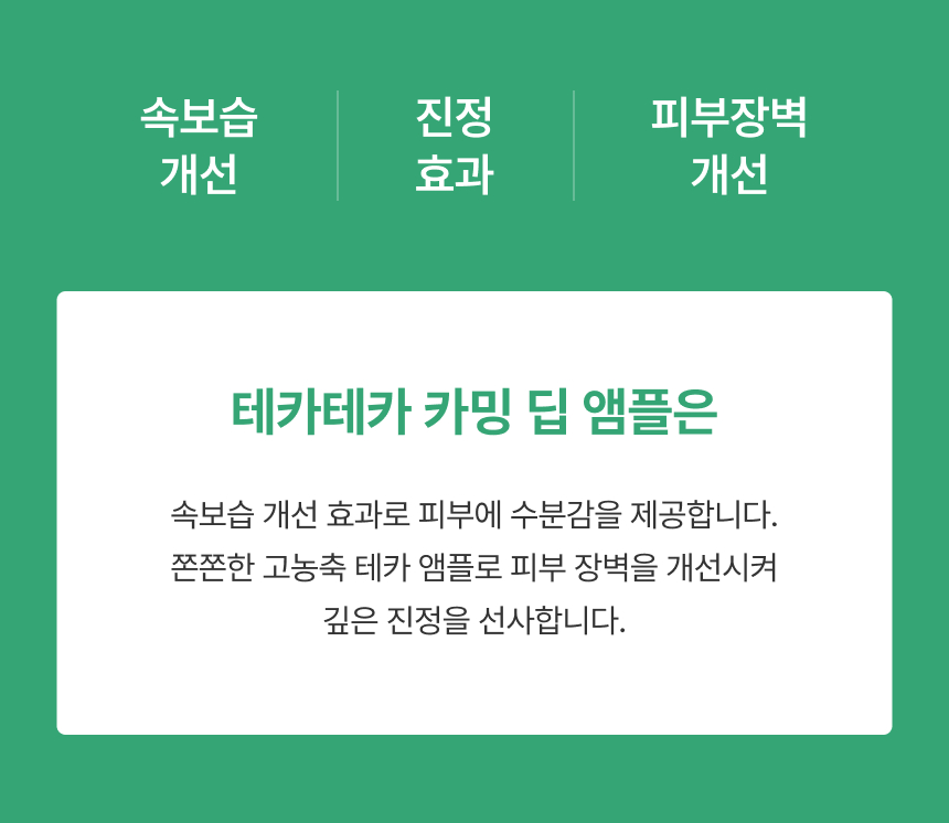 정제수, 부틸렌글라이콜, 글리세린, 1,2-헥산다이올, 소듐하이알루로네이트, 판테놀, 베타인, 소듐시트레이트, 하이드록시에틸셀룰로오스, 에틸헥실글리세린, 병풀추출물, 시트릭애씨드, 소듐파이테이트, 약모밀추출물, 덱스트린, 우엉뿌리추출물, 카카오추출물, 진흙버섯추출물, 쇠비름추출물, 체이스트트리추출물, 마트리카리아꽃추출물, 병풀뿌리추출물, 병풀잎추출물, 다이소듐포스페이트, 폴리솔베이트60, 소듐포스페이트, 다이메틸실란올하이알루로네이트, 하이드롤라이즈드하이알루로닉애씨드, 하이드롤라이즈드소듐하이알루로네이트, 하이알루로닉애씨드, 포타슘하이알루로네이트, 소듐폴리아크릴레이트, 소듐하이알루로네이트크로스폴리머, 하이드록시프로필트라이모늄하이알루로네이트, 소듐하이알루로네이트다이메틸실란올, 아시아틱애씨드(50ppb), 아시아티코사이드(50ppb), 소듐아세틸레이티드하이알루로네이트, 마데카식애씨드(5ppb), 마데카소사이드(5ppb)