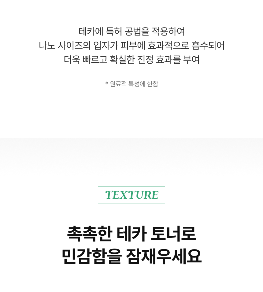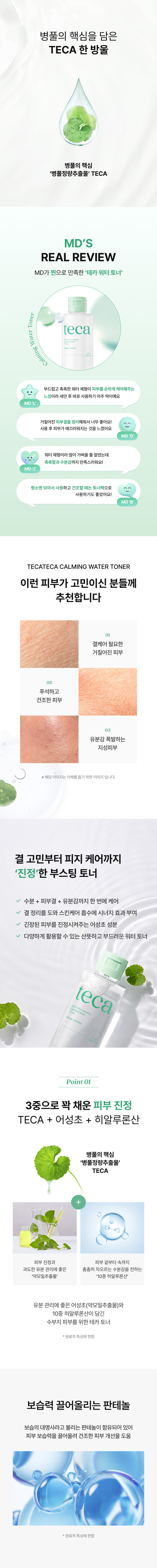 정제수, 글리세린, 1,2-헥산다이올, 베타인, 글리세레스-26, 판테놀, 알란토인, 에틸헥실글리세린, 아크릴레이트/C10-30알킬아크릴레이트크로스폴리머, 병풀추출물, 소듐파이테이트, 트로메타민, 약모밀추출물, 병풀잎추출물, 병풀뿌리추출물, 부틸렌글라이콜, 하이드롤라이즈드하이알루로닉애씨드, 하이드롤라이즈드소듐하이알루로네이트, 다이메틸실란올하이알루로네이트, 하이알루로닉애씨드, 포타슘하이알루로네이트, 소듐하이알루로네이트, 소듐하이알루로네이트크로스폴리머, 하이드록시프로필트라이모늄하이알루로네이트, 아시아틱애씨드(50ppb), 아시아티코사이드(50ppb), 소듐하이알루로네이트다이메틸실란올, 소듐아세틸레이티드하이알루로네이트, 마데카식애씨드(5ppb), 마데카소사이드