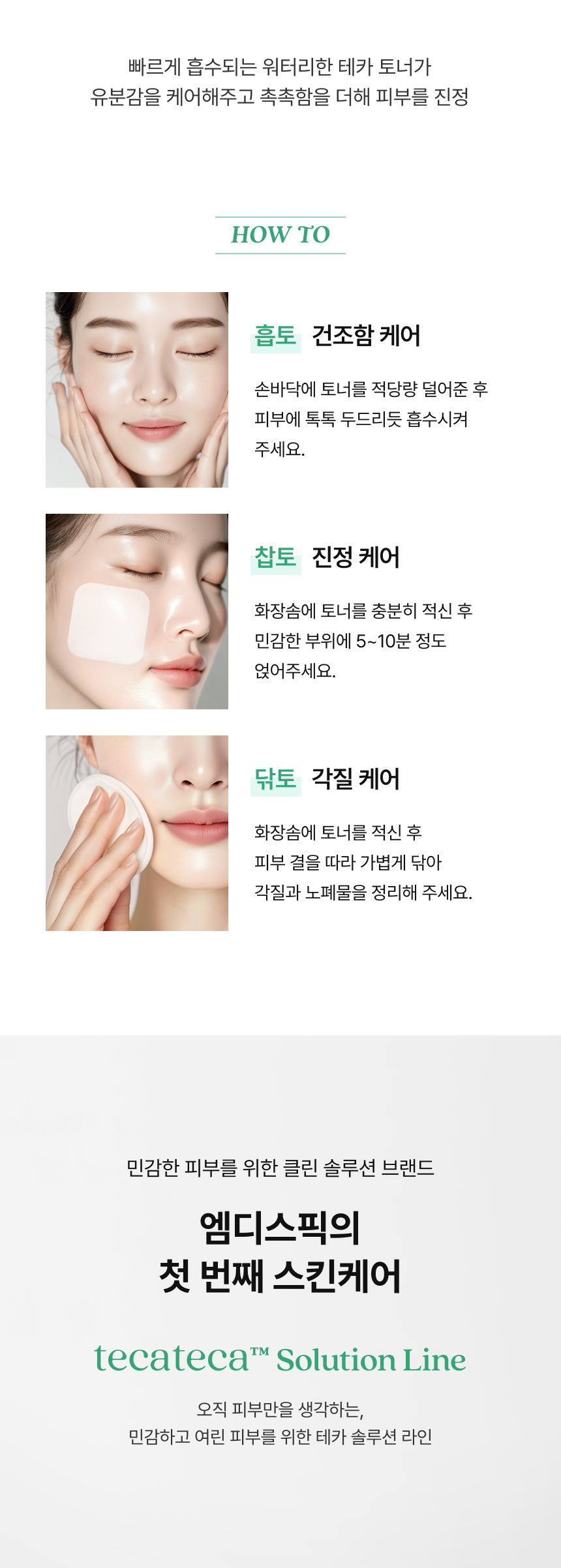 적당량을 취해 부드럽게 펴 발라 흡수시켜줍니다.