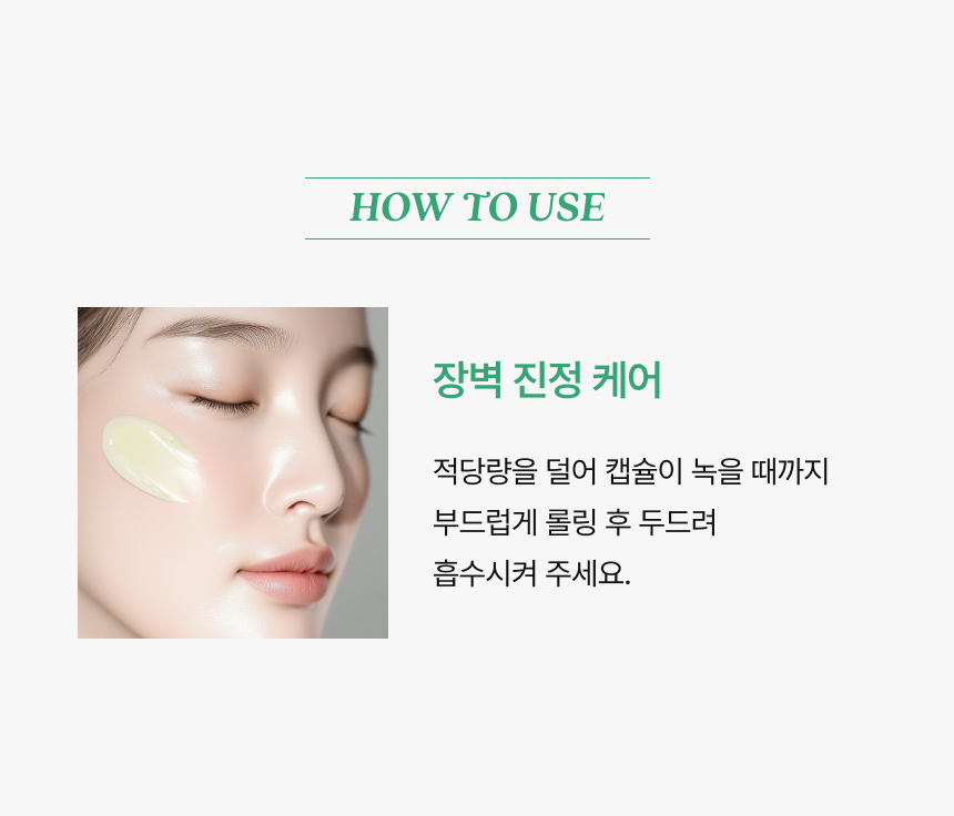 내용물을 적당량 덜어 피부결을 따라 부드럽게 펴 발라준 후 가볍게 두드려 흡수시켜 줍니다.