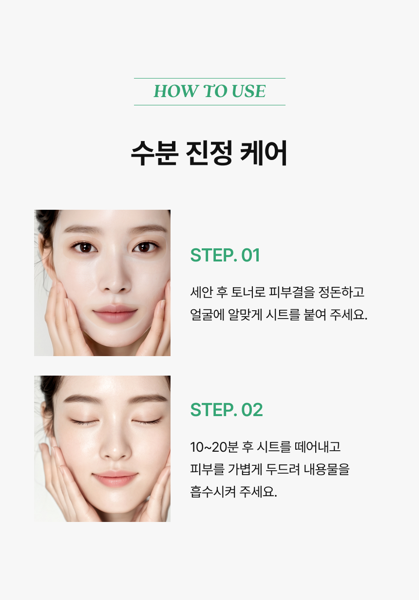 1. 세안 후 토너로 피부결을 정돈합니다. 2. 얼굴에 알맞게 시트를 붙입니다. 3. 10~20분 후에 시트를 떼어내고 가볍게 두드려 남은 내용물을 흡수시켜 줍니다.